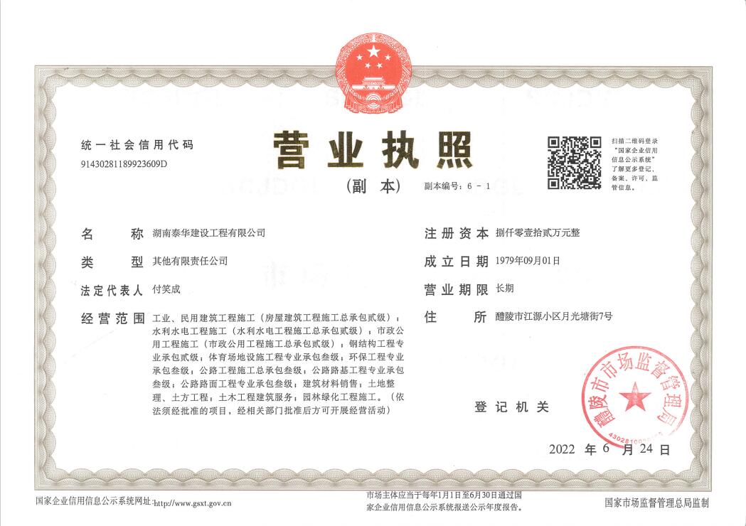 湖南泰華建設工程有限公司一家房屋建筑工程施工總承包貳級,水利水電工程施工總承包貳級,市政公用工程施工總承包貳級,鋼結構工程施工專業承包二級,消防設施工程專業承包貳級,建筑裝修裝飾工程專業承包貳級;公路工程施工總承包叁級,鋼結構、體育設施、環保工程、公路路面工程、公路路基工程專業承包叁級企業。…